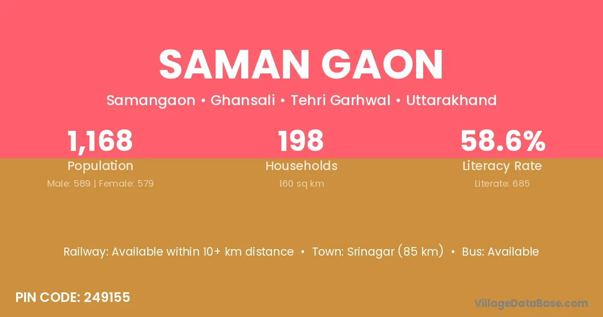 Srinagar (85 km) is the nearest town to Saman Gaon village for major economic activities and is located approximately 85 km away.