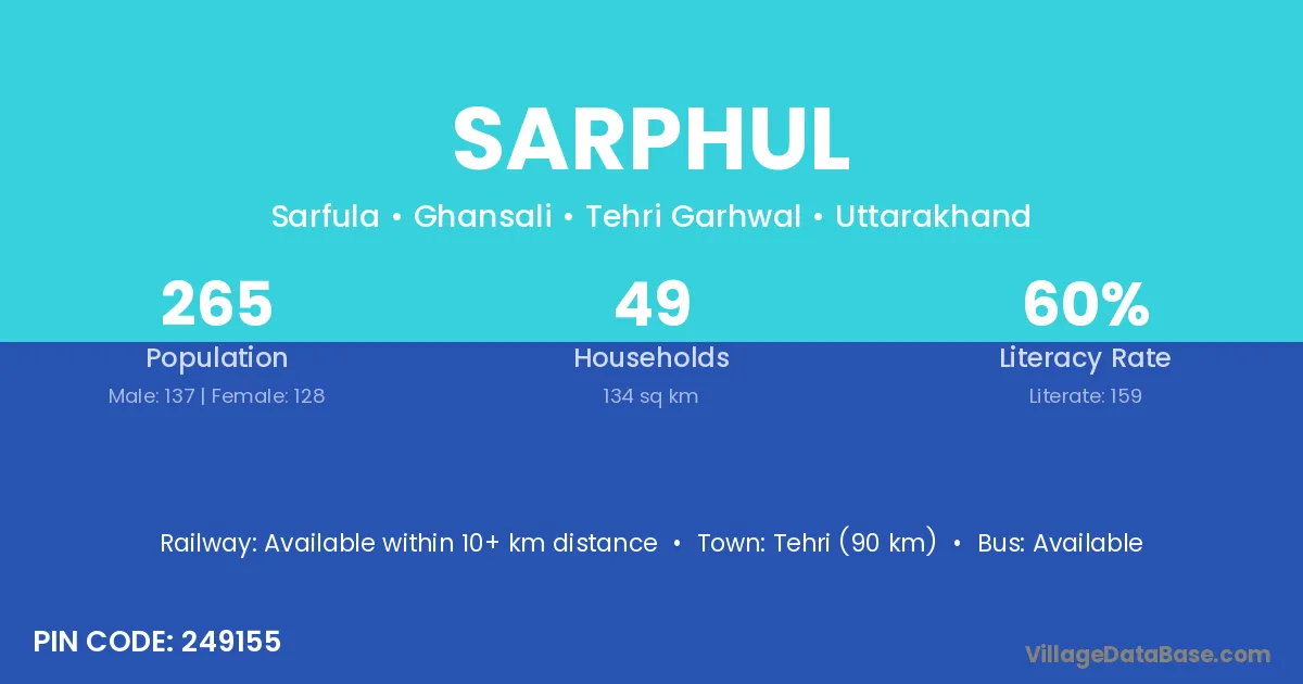 Tehri (90 km) is the nearest town to Sarphul village for major economic activities and is located approximately 90 km away.