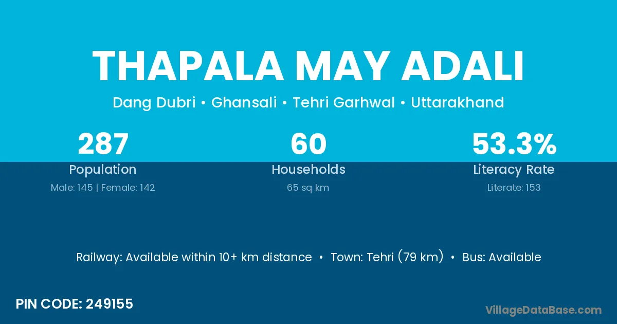 Tehri (79 km) is the nearest town to Thapala May Adali village for major economic activities and is located approximately 79 km away.