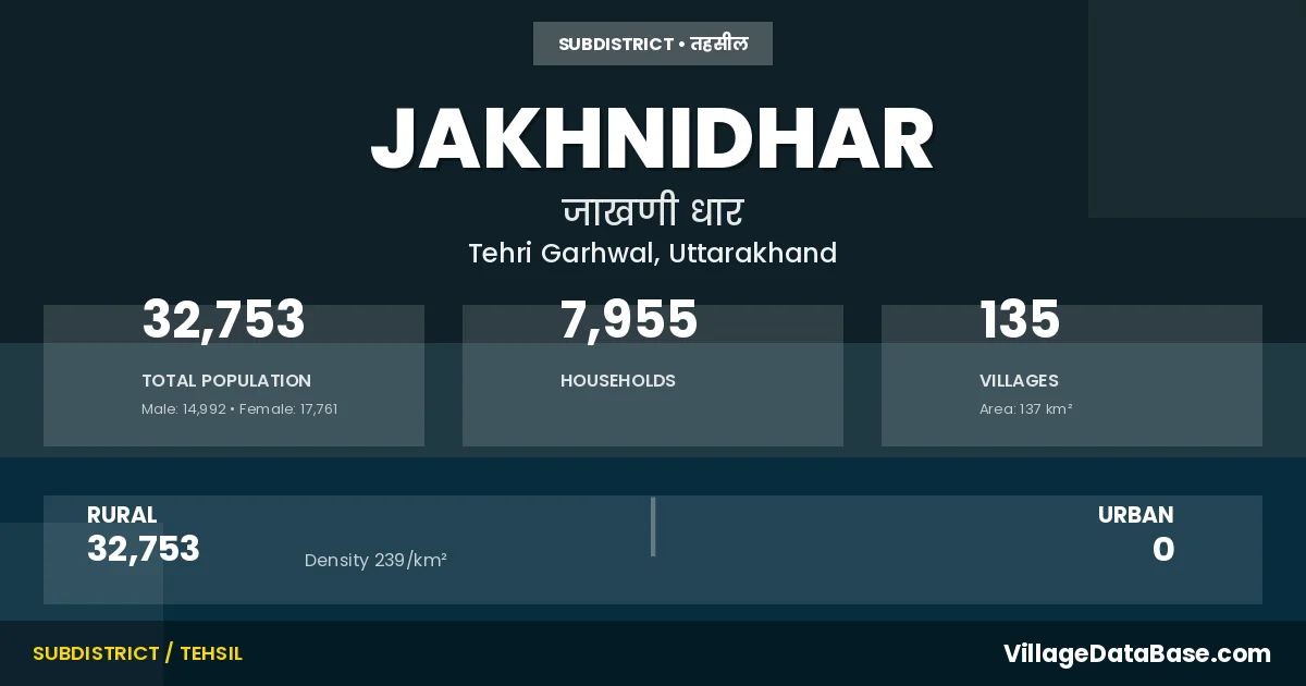 According to the 2011 census The total area of Jakhnidhar Tehsil is 137 km², with a population of 32753 people. The population density is 239 inhabitants per square kilometre, and there are approximately 7955 houses in the sub district.