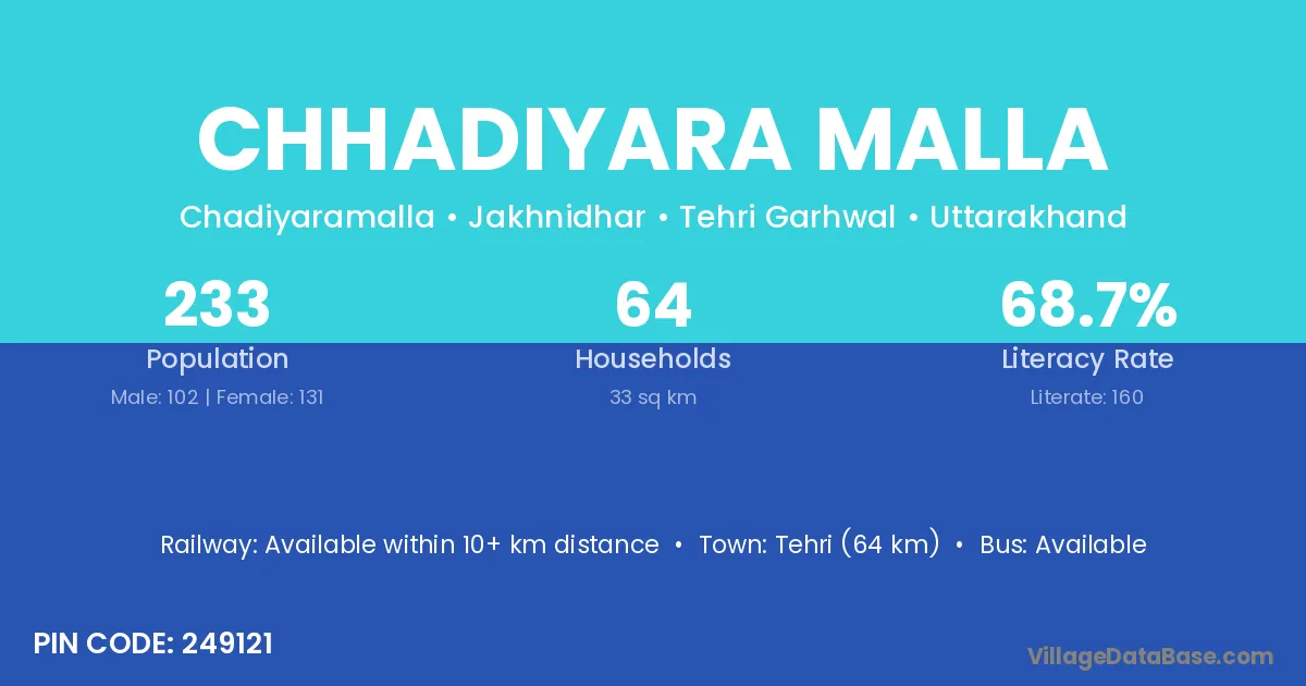 Tehri (64 km) is the nearest town to Chhadiyara Malla village for major economic activities and is located approximately 64 km away.