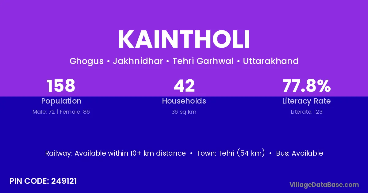 Tehri (54 km) is the nearest town to Kaintholi village for major economic activities and is located approximately 54 km away.