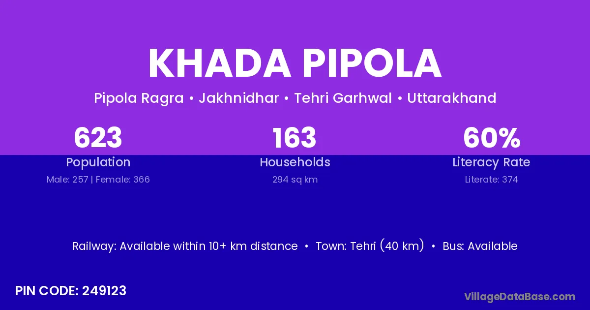 Tehri (40 km) is the nearest town to Khada Pipola village for major economic activities and is located approximately 40 km away.