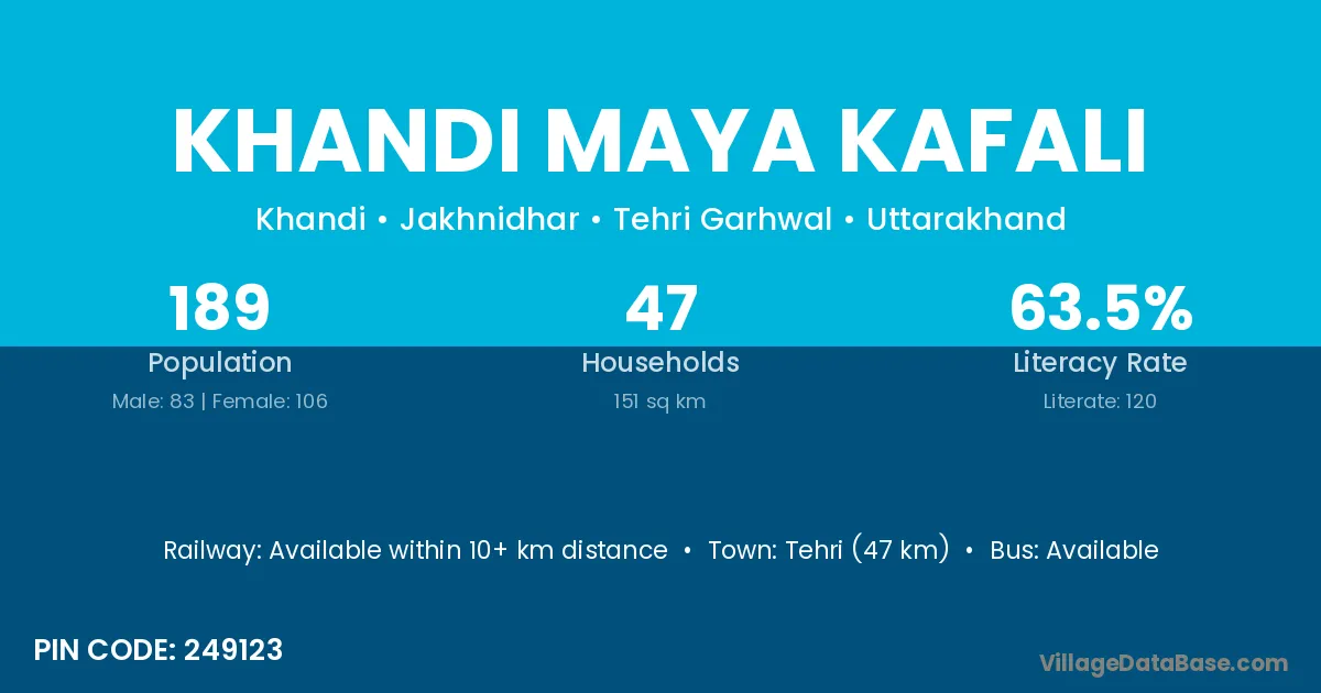 Tehri (47 km) is the nearest town to Khandi Maya Kafali village for major economic activities and is located approximately 47 km away.