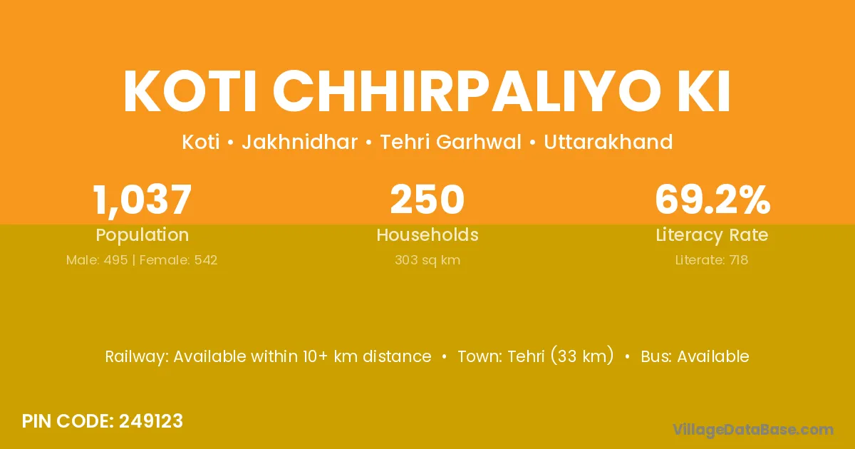 Tehri (33 km) is the nearest town to Koti Chhirpaliyo Ki village for major economic activities and is located approximately 33 km away.