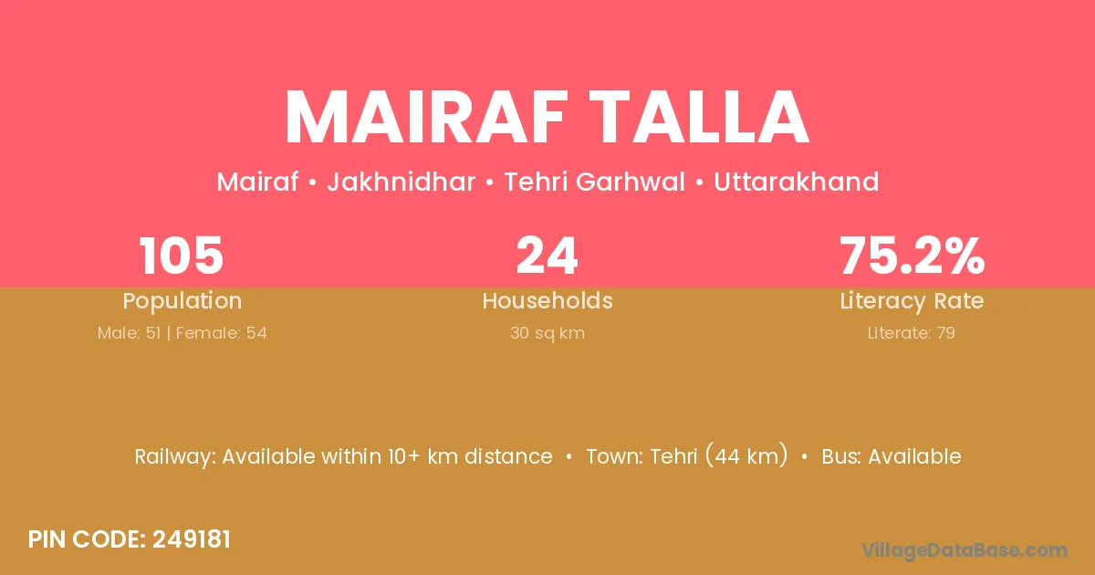 Tehri (44 km) is the nearest town to Mairaf Talla village for major economic activities and is located approximately 44 km away.