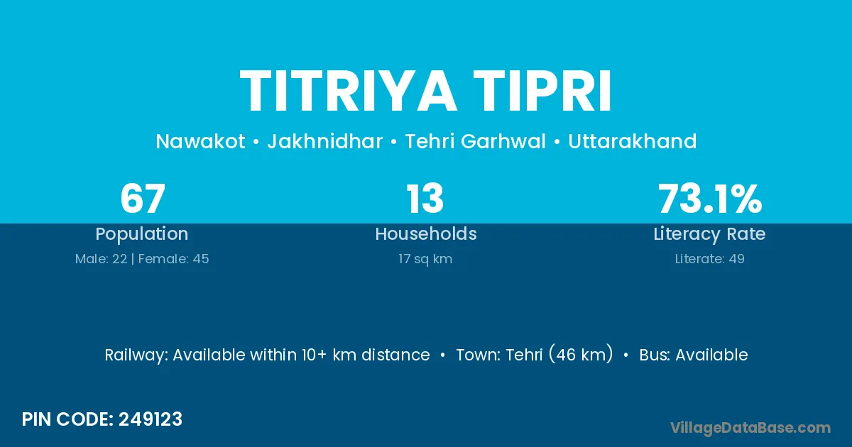 Tehri (46 km) is the nearest town to Titriya Tipri village for major economic activities and is located approximately 46 km away.