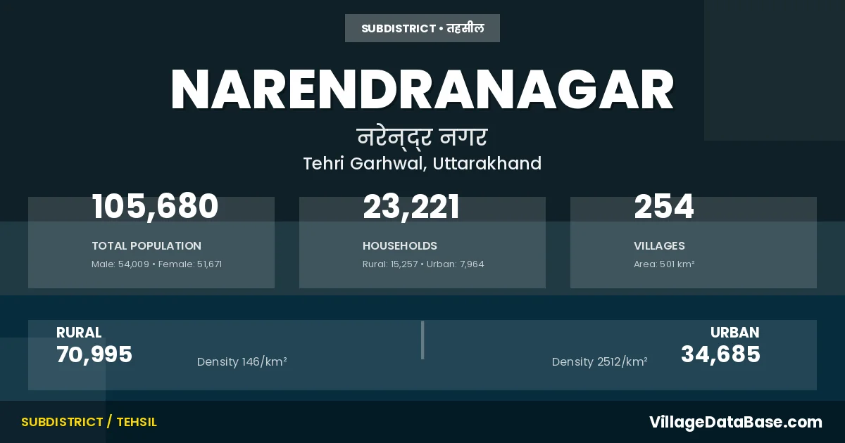 According to the 2011 census The total area of Narendranagar Tehsil is 501 km², with a population of 105680 people. The population density is 211 inhabitants per square kilometre, and there are approximately 23221 houses in the sub district.