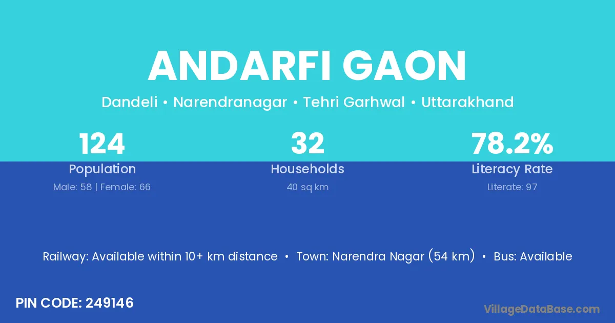 Narendra Nagar (54 km) is the nearest town to Andarfi Gaon village for major economic activities and is located approximately 54 km away.