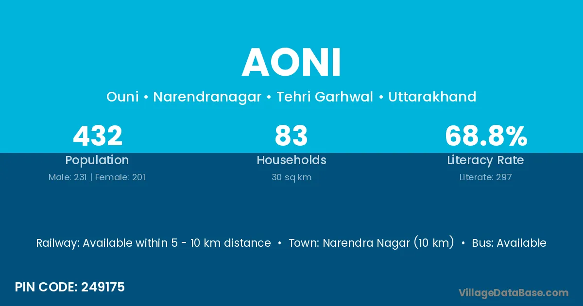 Narendra Nagar (10 km) is the nearest town to Aoni village for major economic activities and is located approximately 10 km away.