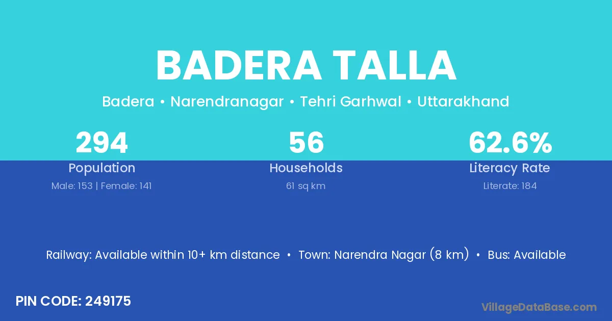 Narendra Nagar (8 km) is the nearest town to Badera Talla village for major economic activities and is located approximately 8 km away.