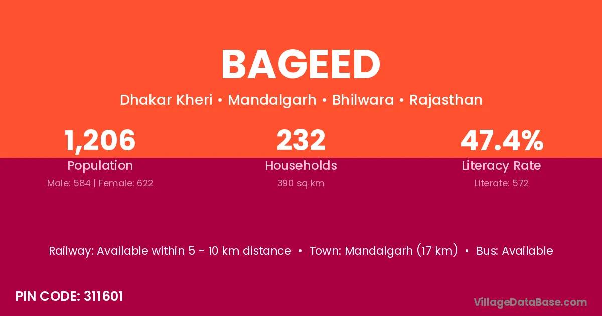 The literacy rate of Bageed village is 59.39%. Male literacy stands at 60.16% and female literacy at 56.76%.