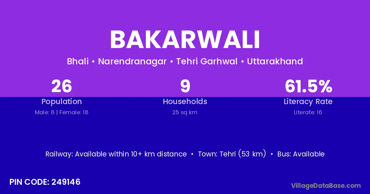 Tehri (53 km) is the nearest town to Bakarwali village for major economic activities and is located approximately 53 km away.