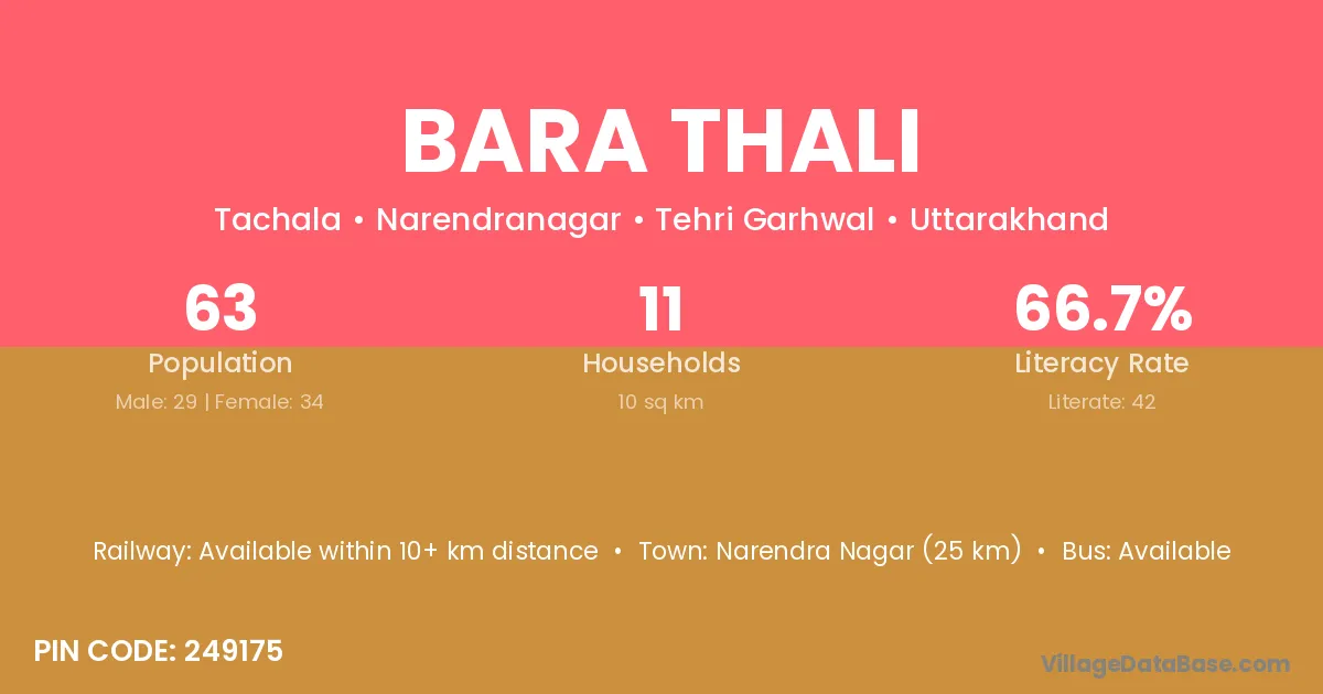 Narendra Nagar (25 km) is the nearest town to Bara Thali village for major economic activities and is located approximately 25 km away.