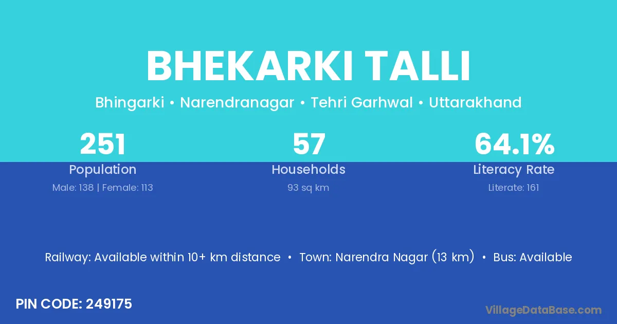 Narendra Nagar (13 km) is the nearest town to Bhekarki Talli village for major economic activities and is located approximately 13 km away.