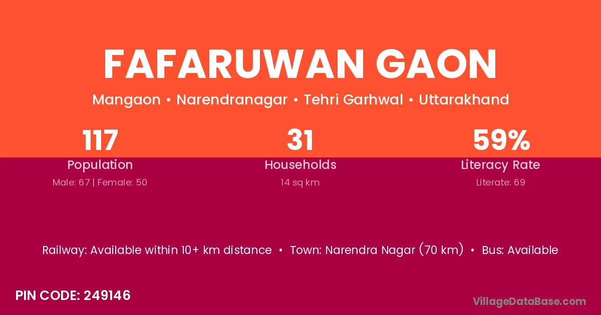 Narendra Nagar (70 km) is the nearest town to Fafaruwan Gaon village for major economic activities and is located approximately 70 km away.