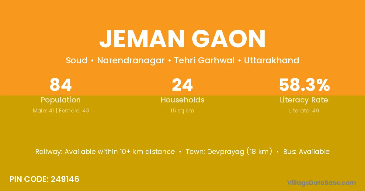 Devprayag (18 km) is the nearest town to Jeman Gaon village for major economic activities and is located approximately 18 km away.