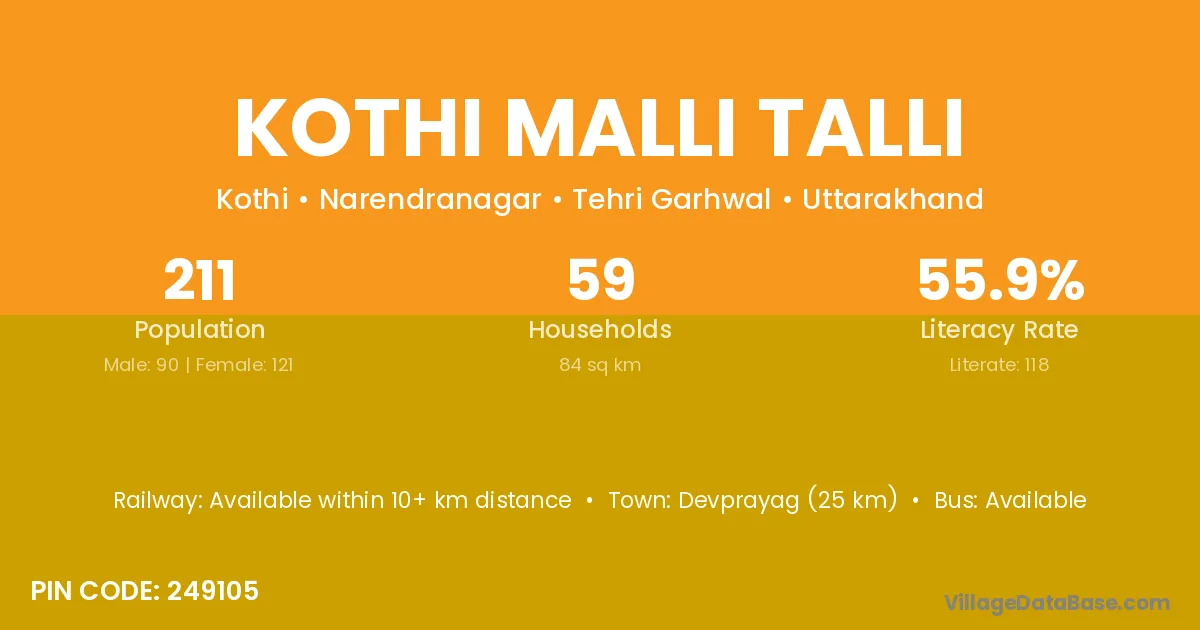 Devprayag (25 km) is the nearest town to Kothi Malli Talli village for major economic activities and is located approximately 25 km away.