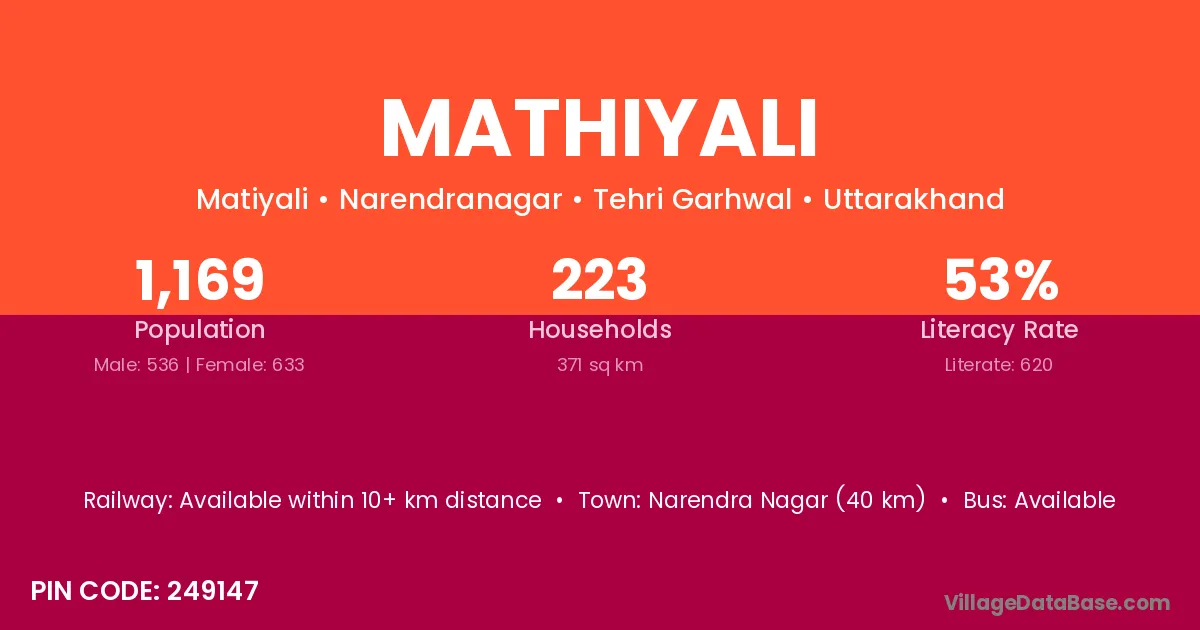 Narendra Nagar (40 km) is the nearest town to Mathiyali village for major economic activities and is located approximately 40 km away.