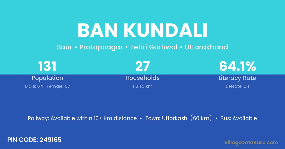 Uttarkashi (60 km) is the nearest town to Ban Kundali village for major economic activities and is located approximately 60 km away.