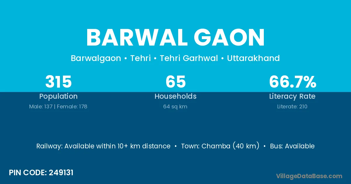 Uttarkashi (59 km) is the nearest town to Barwal Gaon village for major economic activities and is located approximately 59 km away.