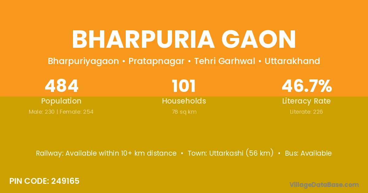 Uttarkashi (56 km) is the nearest town to Bharpuria Gaon village for major economic activities and is located approximately 56 km away.