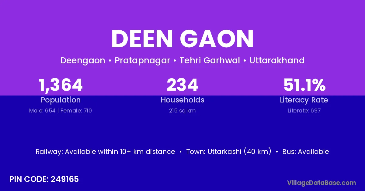 Uttarkashi (40 km) is the nearest town to Deen Gaon village for major economic activities and is located approximately 40 km away.