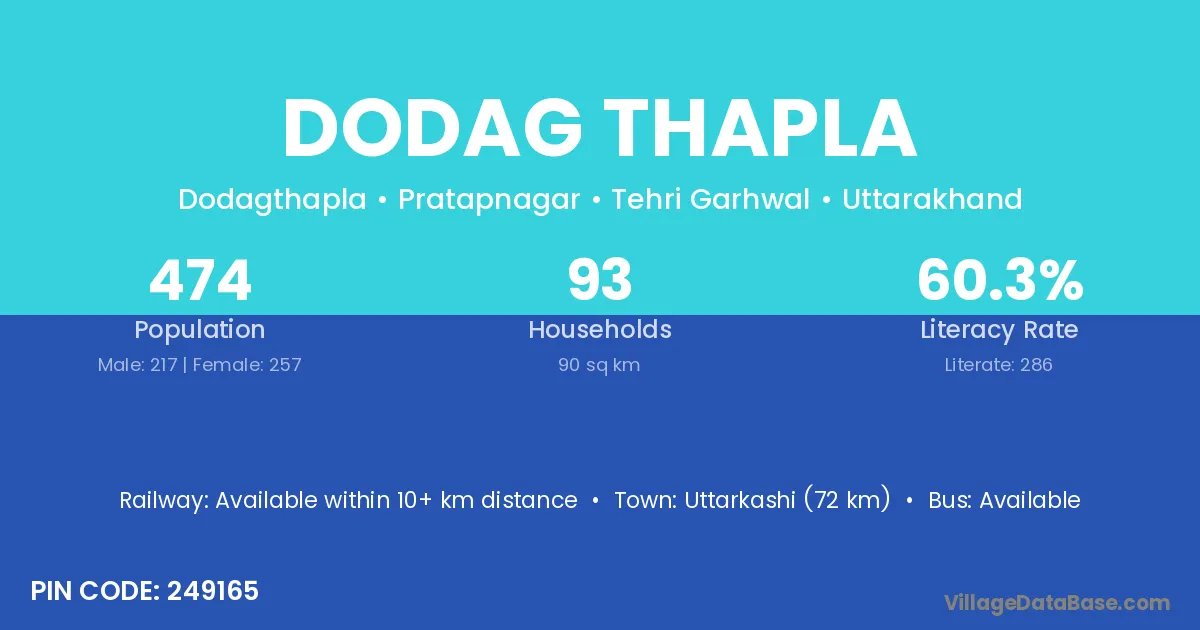 Uttarkashi (72 km) is the nearest town to Dodag Thapla village for major economic activities and is located approximately 72 km away.