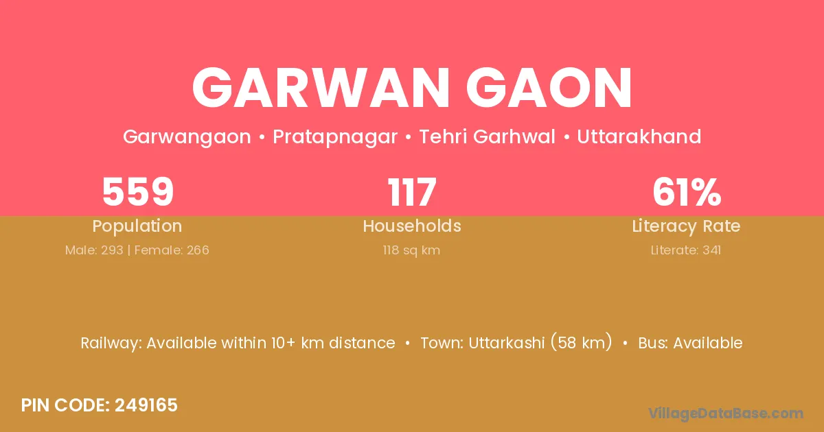 Uttarkashi (58 km) is the nearest town to Garwan Gaon village for major economic activities and is located approximately 58 km away.