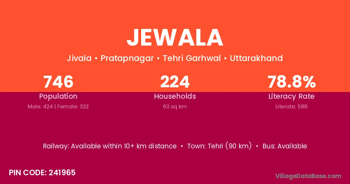 Tehri (90 km) is the nearest town to Jewala village for major economic activities and is located approximately 90 km away.