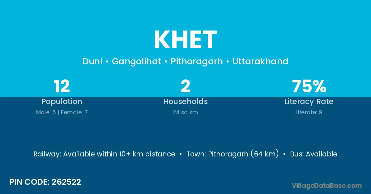 The literacy rate of Khet village is 66.75%. Male literacy stands at 77.00% and female literacy at 56.94%.