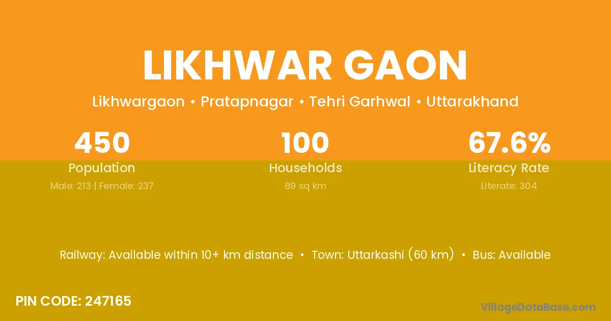 Uttarkashi (60 km) is the nearest town to Likhwar Gaon village for major economic activities and is located approximately 60 km away.