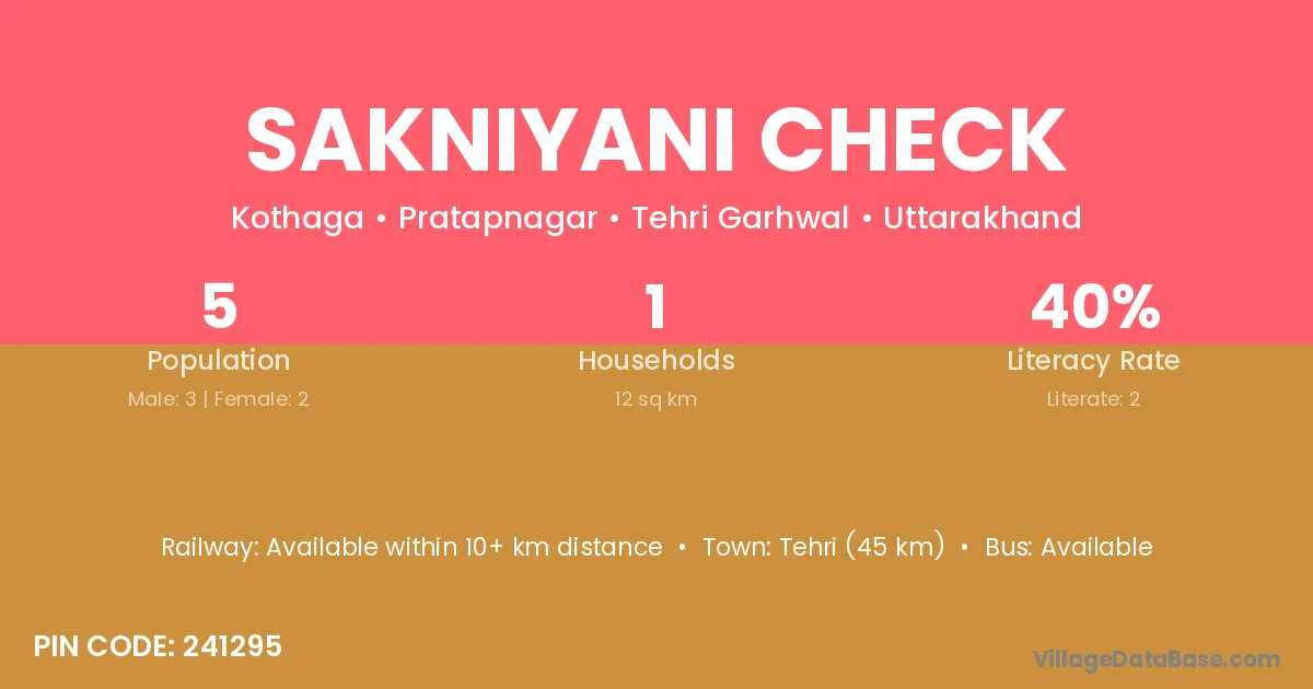 Sakniyani Check village has a total population of 5 people, of which 3 are males and 2 are females.