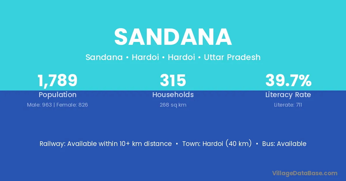 The literacy rate of Sandana village is 72.96%. Male literacy stands at 88.12% and female literacy at 61.36%.
