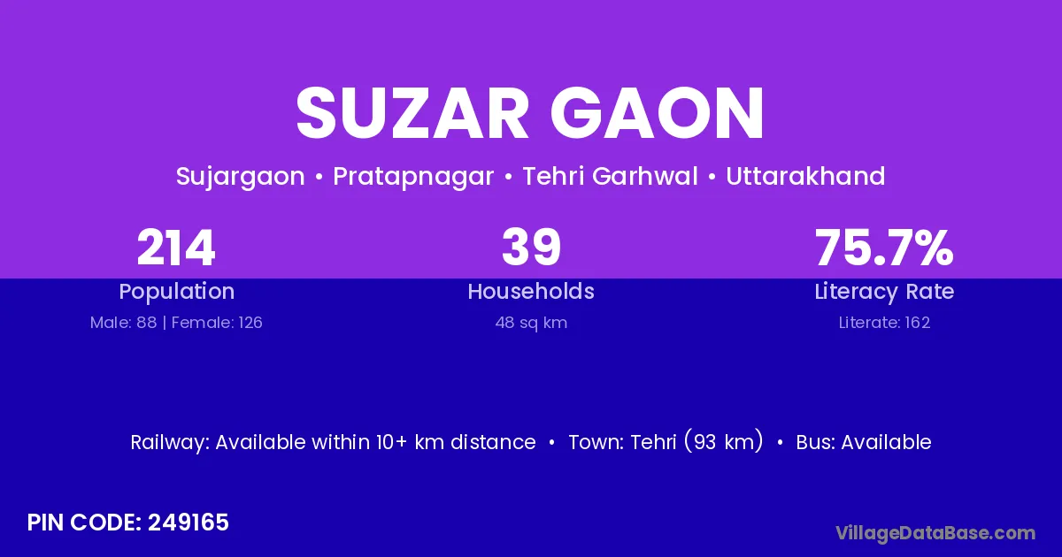 Tehri (93 km) is the nearest town to Suzar Gaon village for major economic activities and is located approximately 93 km away.