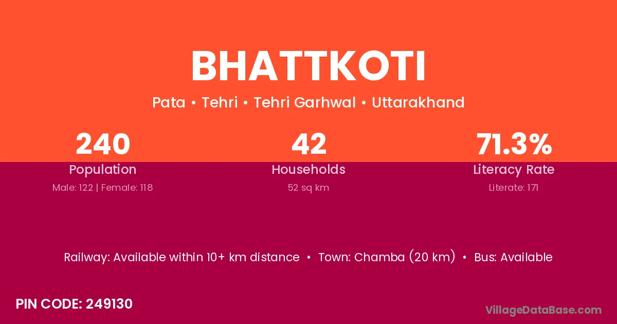 Bhattkoti village has a total population of 240 people, of which 122 are males and 118 are females.