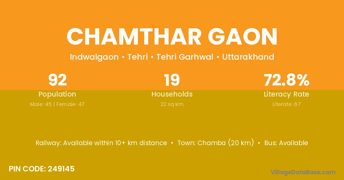 Chamba (20 km) is the nearest town to Chamthar Gaon village for major economic activities and is located approximately 20 km away.