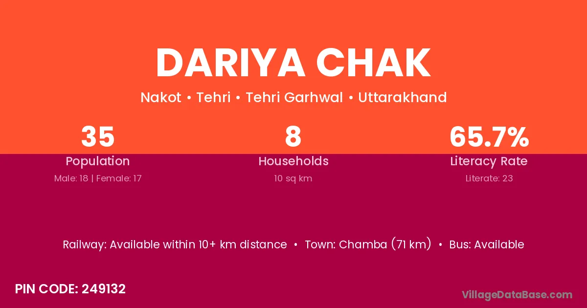 Dariya Chak village has a total population of 35 people, of which 18 are males and 17 are females.