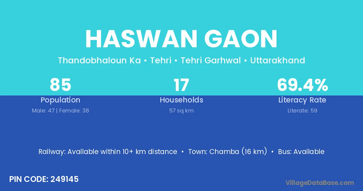 Chamba (16 km) is the nearest town to Haswan Gaon village for major economic activities and is located approximately 16 km away.