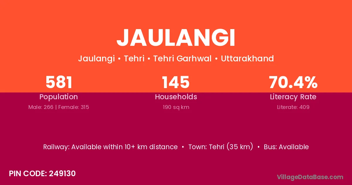 Tehri (35 km) is the nearest town to Jaulangi village for major economic activities and is located approximately 35 km away.