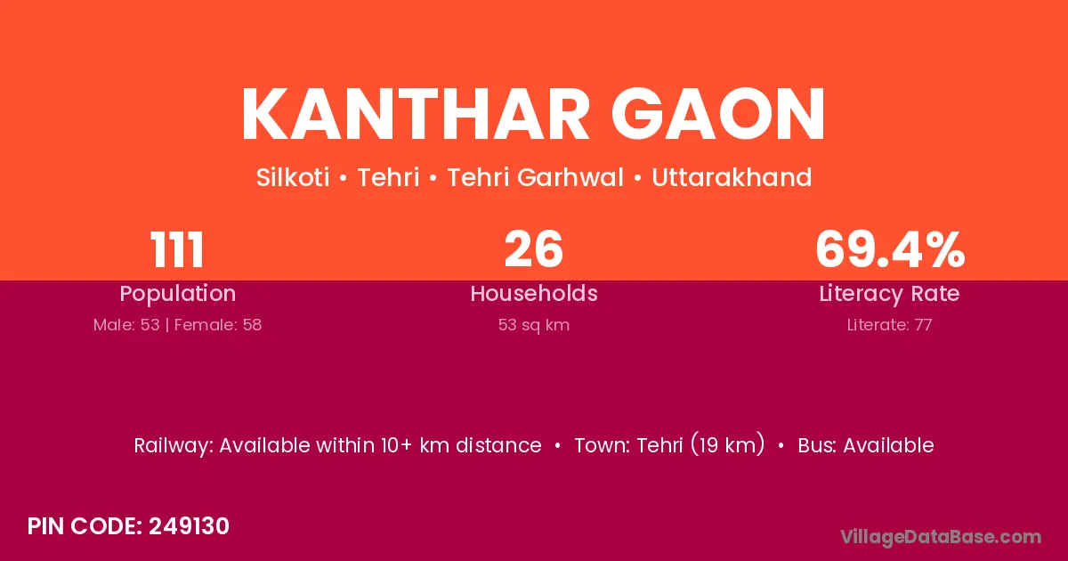 Tehri (19 km) is the nearest town to Kanthar Gaon village for major economic activities and is located approximately 19 km away.