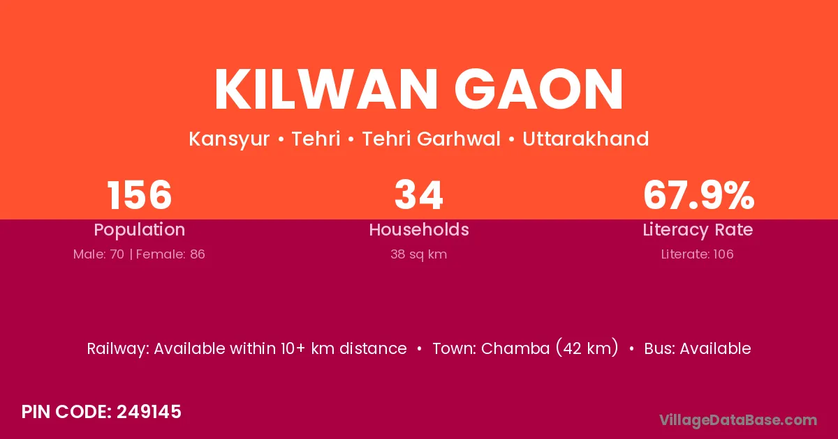 Chamba (42 km) is the nearest town to Kilwan Gaon village for major economic activities and is located approximately 42 km away.