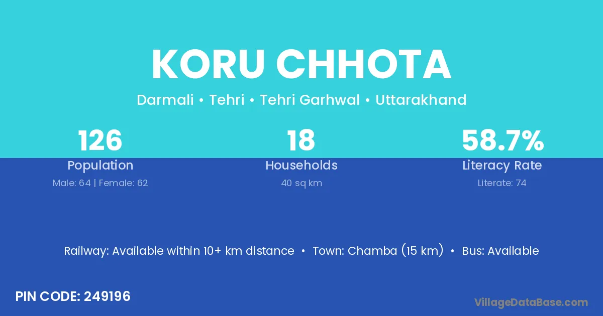 Chamba (15 km) is the nearest town to Koru Chhota village for major economic activities and is located approximately 15 km away.