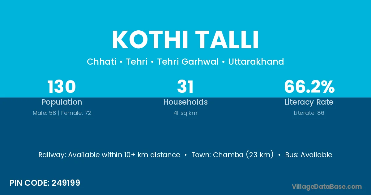 Chamba (23 km) is the nearest town to Kothi Talli village for major economic activities and is located approximately 23 km away.
