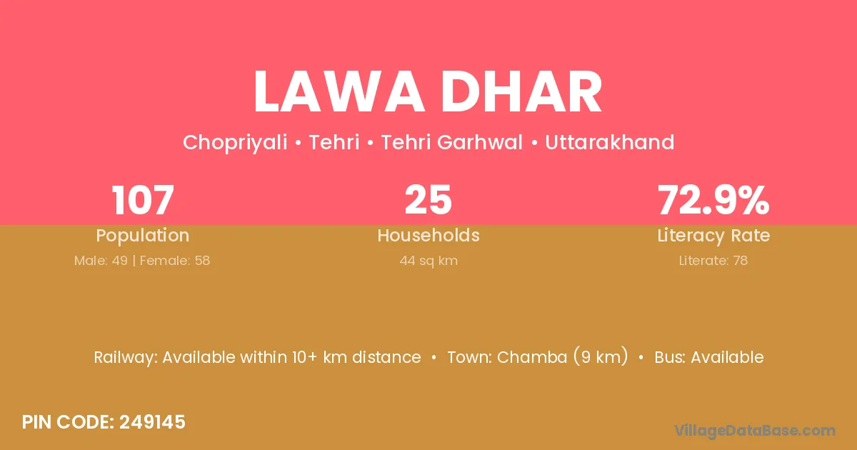 Lawa Dhar village has a total population of 107 people, of which 49 are males and 58 are females.
