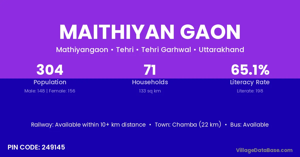 Chamba (22 km) is the nearest town to Maithiyan Gaon village for major economic activities and is located approximately 22 km away.