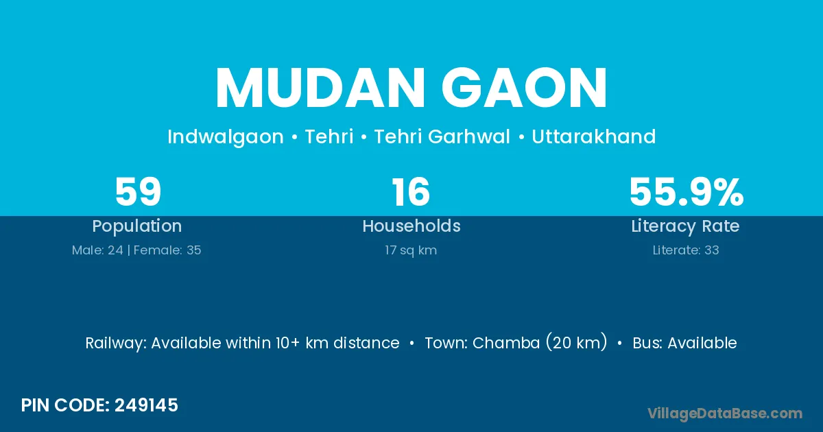 Chamba (20 km) is the nearest town to Mudan Gaon village for major economic activities and is located approximately 20 km away.