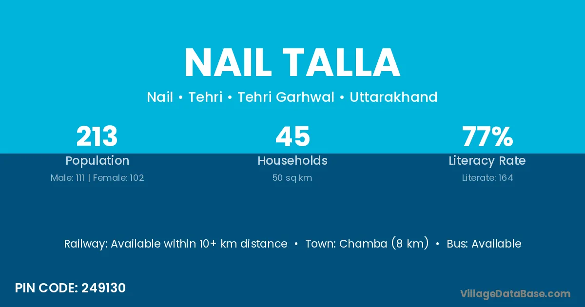 Chamba (8 km) is the nearest town to Nail Talla village for major economic activities and is located approximately 8 km away.