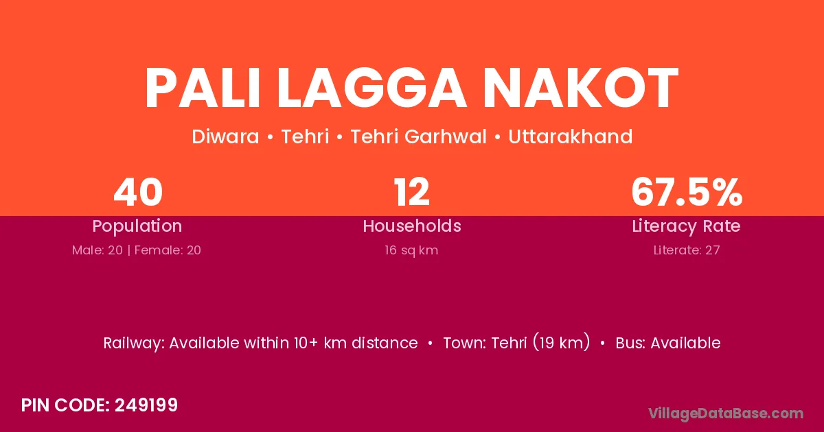 Tehri (19 km) is the nearest town to Pali Lagga Nakot village for major economic activities and is located approximately 19 km away.