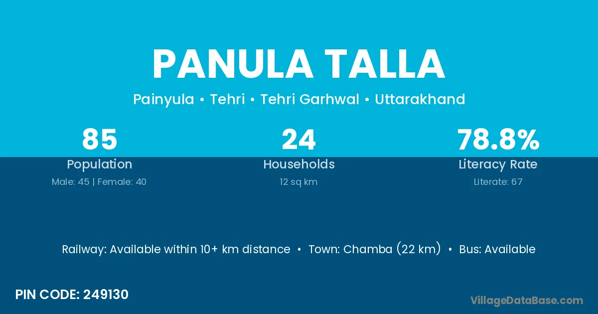 Chamba (22 km) is the nearest town to Panula Talla village for major economic activities and is located approximately 22 km away.